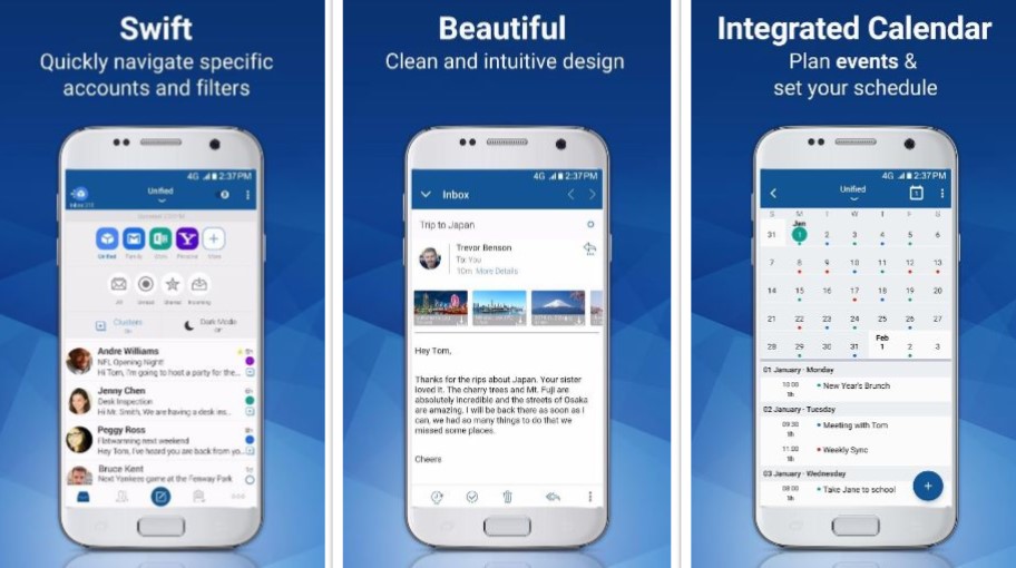 Soporta diferentes organizaciones de correo electrónico como Gmail, Yahoo, Exchange, Outlook, iCloud, Office 365, AOL, así como registros personalizados (POP e IMAP). Al instalar BlueMail, muestra la alternativa de incluir una cuenta de correo electrónico. Después de incluir una, también puede continuar coordinando otras grabaciones. Independientemente de las diferentes cuentas de correo electrónico, es posible que tenga diferentes ubicaciones para un registro determinado cuando el proveedor lo sustenta, generalmente denominados apodos. A continuación están los aspectos más destacados de BlueMail, que me parecieron tentadores.
