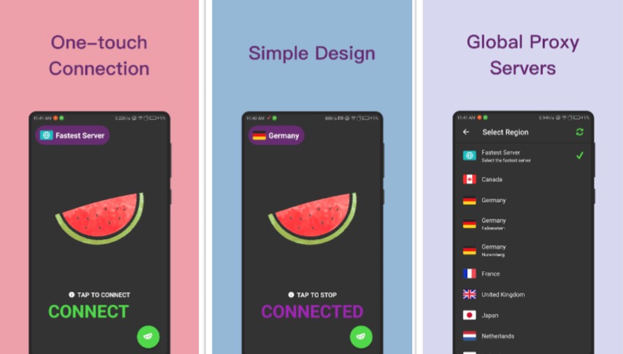 Desde el principio, Melón VPN para PC tiene una interfaz de usuario extremadamente adolescente y alegre. Para conectarse a VPN Melon, debe tocar la imagen GRANDE de la sandía en la página o pantalla principal. Podemos percibir alguna razón por la que atrae a estudiantes y personas más jóvenes, sin embargo, nos ha dado cierta incertidumbre sobre su exposición como una aplicación VPN.