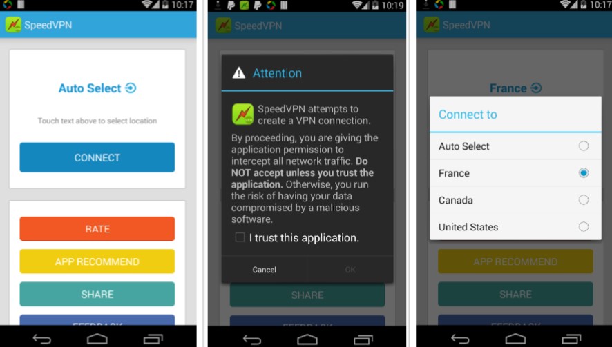 Finalmente, vemos que VelocidadVPN es increíblemente popular y tiene más de 10 millones de descargas. Nos gusta la velocidad de administración porque eso es lo que esperamos de la ayuda paga. Esto significa que es posible que tenga la capacidad de apreciar las cosas geoconfinadas. En cualquier caso, al ser gratuito, te beneficias de diversas promociones. Tampoco tiene la opción de cambiar los niveles de cifrado o elegir servidores específicos dentro de un país. Otro obstáculo para esta administración es el modesto número de naciones accesibles. En conclusión, la prueba del agujero DNS nos impide prescribir SpeedVPN. Le permitirá evitar los bloqueos geográficos, pero eso es todo lo que debe esperar de él.