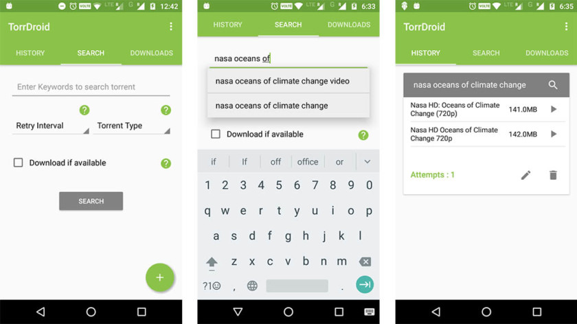 La aplicación se divide convenientemente en tres áreas principales: historial de búsqueda, la búsqueda en sí y las descargas. En el primero, encontrarás todas las solicitudes que has ingresado anteriormente y enlaces directos para descargar archivos. La sección de búsqueda inteligente le permite encontrar los archivos que necesita, según su tipo, fecha de descarga y disponibilidad. Si lo desea, puede seleccionar un archivo torrent previamente descargado o especificar un enlace magnético. El último elemento muestra los archivos que está descargando, el tiempo restante, la velocidad de descarga y otra información.