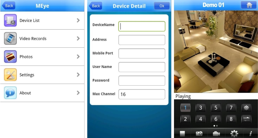 MEye puede acceder y controlar DVR/Cámaras de seguridad/Cámaras IP. Mire secuencias de video de reconocimiento en vivo rápidas y básicas. Puede admitir la mayoría de los DVR fabricados en China. También es compatible con PDA Android.