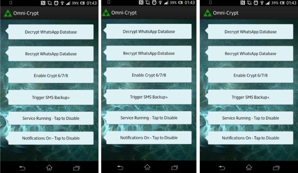 Omni Crypt es un dispositivo Android gratuito que permite a los usuarios actualizar los archivos .crypt5-12 de WhatsApp al cifrado heredado .sepulcher. Esta aplicación encuentra todas las administraciones y filtra todos los archivos. Esto ahora significa que la aplicación Whatsapp fortalecerá los dispositivos y la capacidad de encriptación adicionales de manera adecuada. No es solo una tarea básica, la verdad sea dicha, también muestra una barra de progreso para que pueda monitorear fácilmente las cosas al administrar grandes bases de datos. Bloquea la dirección de la pantalla. No hay forma de interferencia.