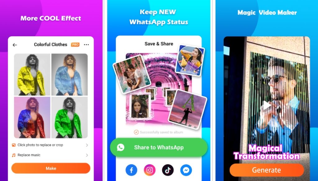 Fly para PC: Use el dispositivo AI Auto Select para cortar la imagen y pegarla en el video Magic Effects para el estado de WhatsApp. Únase sin problemas a sus fotos editadas para crear grabaciones de impacto de encantamiento excepcionales y divertidas para el estado de WhatsApp. ¡Puedes ponerte fácilmente en cualquier video y crear un video de estado único!