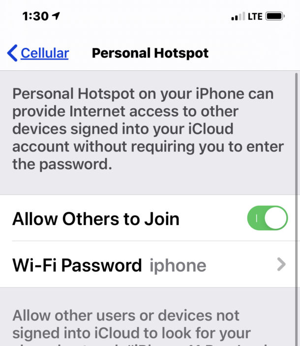 Cuando el iPhone se reinicie, vuelve a Configuración> Punto de acceso personal> habilitar funcióny vuelva a conectarse desde otras computadoras o dispositivos como de costumbre.