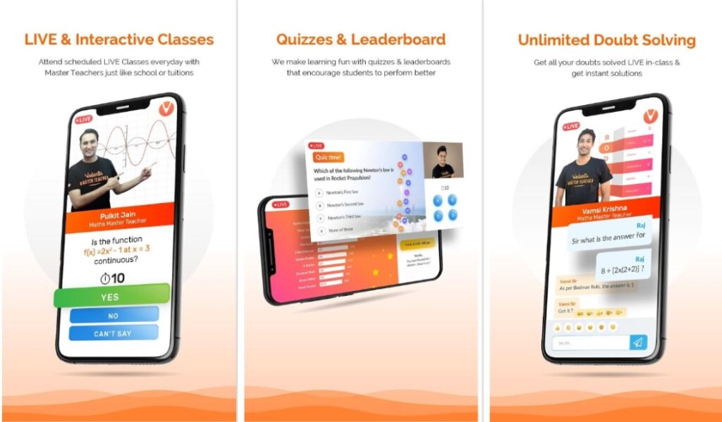 La aplicación de aprendizaje ofrece "lecciones en vivo y grabadas" y "videos conceptuales" para una experiencia de aprendizaje única; "Módulos de prueba" para ayudar a los estudiantes de CBSE, ICSE y State Board a prepararse para los exámenes, soluciones de matemáticas y ciencias de NCERT, plan de estudios detallado, trabajos de años anteriores, trabajos de muestra, notas de revisión, hojas de fórmulas y más para Class 6, Class 7, Class 8 , Class 9, Class 10, Class 11, Class 12 y Dropper, IIT JEE Crash Course, NEET Crash Course y Micro - cursos temáticos.